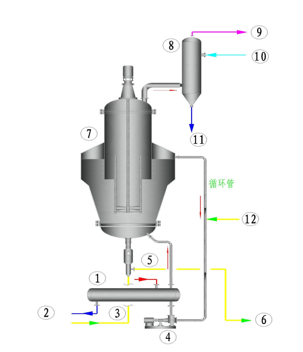 過飽和度的產(chǎn)生是在蒸汽蒸發(fā)室,液體循環(huán)方向是經(jīng)過導流管快速上升至蒸發(fā)液面,然后使過飽和液沿環(huán)形面積流向下部,屬于快升慢降型循環(huán),在強烈循環(huán)區(qū)內晶漿的濃度是一致的,所以過飽和度的消除容易,而且過飽和溶液始終與加料溶液并流。由于攪拌阻力小,循環(huán)量較大,所以這是一種過飽和度最低的結晶器型式。結晶器底部通常設置有淘洗腿,通過淘洗分級取出大粒度晶體。