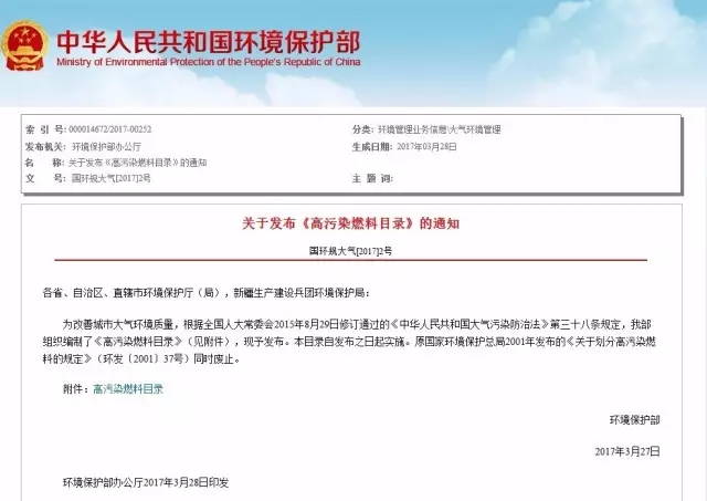 關(guān)于發(fā)布《高污染燃料目錄》的通知國環(huán)規(guī)大氣[2017]2號各省、自治區(qū)、直轄市環(huán)境保護(hù)廳(局),新疆生產(chǎn)建設(shè)兵團(tuán)環(huán)境保護(hù)局: 為改善城市大氣環(huán)境質(zhì)量,根據(jù)全國人大常委會2015年8月29日修訂通過的《中華人民共和國大氣污染防治法》第三十八條規(guī)定,我部組織編制了《高污染燃料目錄》(見附件),現(xiàn)予發(fā)布。...