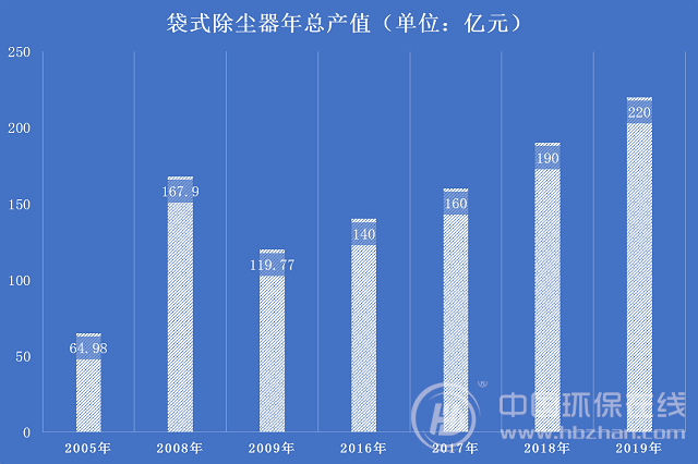 統(tǒng)計(jì)數(shù)據(jù)顯示,我國袋式除塵行業(yè)總產(chǎn)值在2005年~2008年期間增長最快,從64.98 億元/年上升至167.90 億元/年,年均增長率高達(dá)37.23%。2009年受全球金融危機(jī)影響,總產(chǎn)值下滑至119.77億元。過去幾年,袋式除塵行業(yè)處于去產(chǎn)能的深度調(diào)整期,總產(chǎn)值在150億元/年左右徘徊。