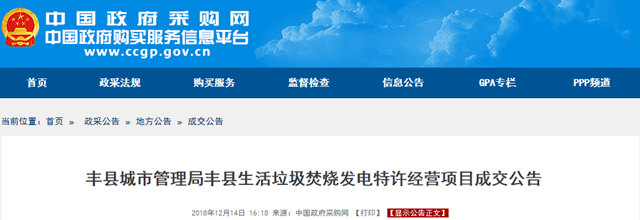 江蘇省豐縣生活垃圾焚燒發(fā)電特許經(jīng)營(yíng)項(xiàng)目發(fā)布成交公告,中國(guó)光大綠色環(huán)保有限公司成為中標(biāo)的社會(huì)資本方,生活垃圾處理服務(wù)費(fèi)單價(jià)為65元/噸。