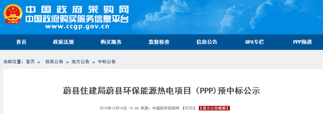 原標題:74.1元/噸,中國環(huán)保預中標河北蔚縣環(huán)保能源熱電PPP項目