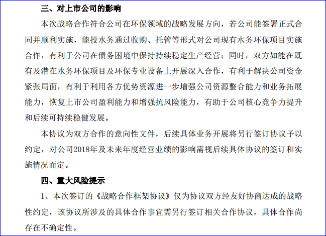 同時(shí),雙方如能在既有及潛在水務(wù)環(huán)保項(xiàng)目及環(huán)保專業(yè)設(shè)備上開展深入合作,有利于解決公司資金緊張局面,有利于利用各方優(yōu)勢(shì)資源進(jìn)一步增強(qiáng)公司資源整合能力和業(yè)務(wù)拓展能力,恢復(fù)上市公司盈利能力和增強(qiáng)抗風(fēng)險(xiǎn)能力,有助于公司核心競(jìng)爭(zhēng)力提升和后續(xù)可持續(xù)穩(wěn)健發(fā)展。