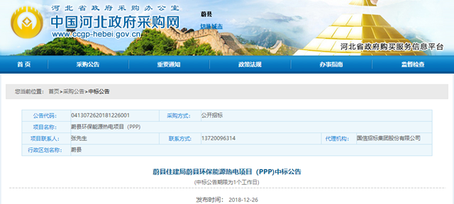2018年12月26日,河北省蔚縣環(huán)保能源熱電項(xiàng)目(PPP)發(fā)布中標(biāo)公告,中國環(huán)境保護(hù)集團(tuán)有限公司成為中標(biāo)的社會(huì)資本方,中標(biāo)金額為74.1元/噸。