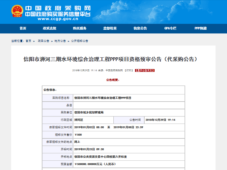 原標(biāo)題:預(yù)算50億!河南浉河水環(huán)境綜合治理PPP項(xiàng)目開(kāi)始招標(biāo)