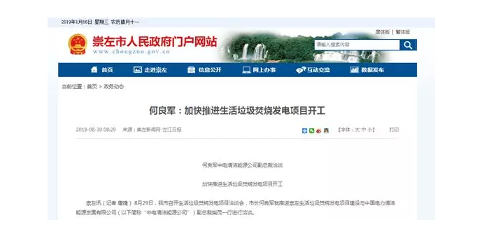 而根據(jù)政府官媒報道顯示,2018年8月29日,崇左市召開生活垃圾焚燒發(fā)電項目洽談會,市長何良軍就推進(jìn)崇左生活垃圾焚燒發(fā)電項目建設(shè)與中國電力清潔能源發(fā)展有限公司副總裁柴茂一行進(jìn)行洽談,旨在加快推進(jìn)生活垃圾焚燒發(fā)電項目開工。