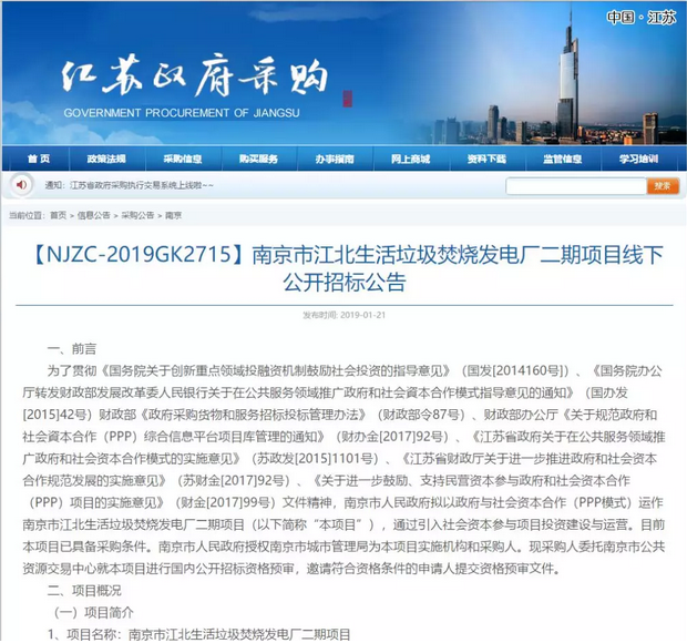 2019年1月21日,江蘇省政府采購網(wǎng)發(fā)布南京市江北生活垃圾焚燒發(fā)電廠二期項目資格預審公告。公告顯示,項目選址位于南京市浦口區(qū)星甸街道,南京市浦口區(qū)星甸街道,絡洼隊以北,董莊隊以南,南京江北環(huán)保產(chǎn)業(yè)園內(nèi)。江北生活垃圾焚燒發(fā)電廠一、二期總規(guī)劃用地400畝,其中本期(二期)面積約196畝。項目估算總投資約為10.7億,項目特許期30年,其中建設(shè)期為2年。每噸垃圾處理費為69元。