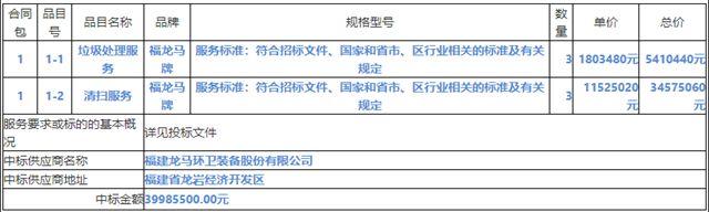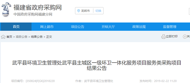 福建省武平縣主城區(qū)一級環(huán)衛(wèi)一體化服務(wù)項(xiàng)目服務(wù)類采購項(xiàng)目發(fā)布結(jié)果公告,福建龍馬環(huán)衛(wèi)裝備股份有限公司成為中標(biāo)的社會資本方,中標(biāo)金額為3998.55萬。