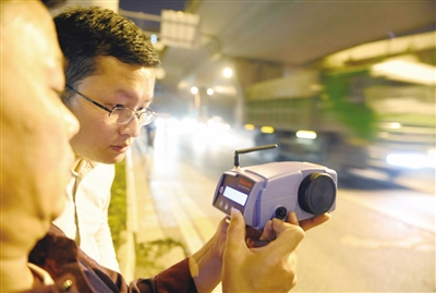 環(huán)保工作人員夜查工地、道路揚塵污染。劉斌 攝影