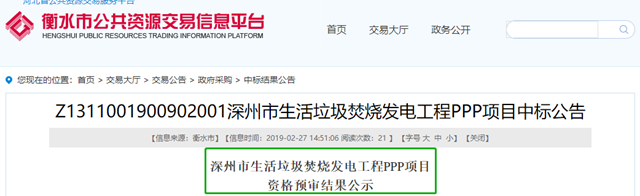 2019年2月27日,河北省深州市生活垃圾焚燒發(fā)電工程PPP項(xiàng)目發(fā)布資格預(yù)審結(jié)果公告。