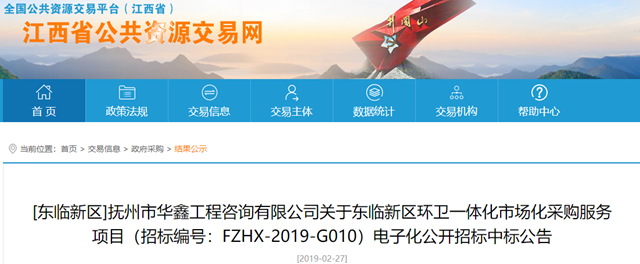 江西省撫州市東臨新區(qū)環(huán)衛(wèi)一體化項(xiàng)目發(fā)布中標(biāo)公告,勁旅環(huán)境科技有限公司成為項(xiàng)目的中標(biāo)社會(huì)資本方,中標(biāo)金額1360.17萬,服務(wù)期限:自2019年3月1日起至2019年12月31日。