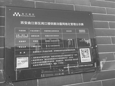 西安曲江新區(qū)閱江樓酒店門口的鐵腕治霾網(wǎng)格化管理公示牌,二維碼方便市民監(jiān)管和舉報(bào) 。