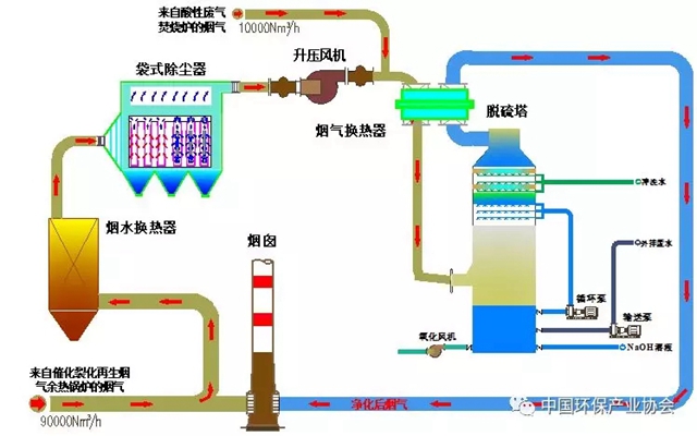催化裂化余熱鍋爐高溫煙氣經煙水換熱器,溫度由230℃~250℃降至150℃~200℃。進入高效袋式除塵器除塵,高效袋式除塵器濾袋采用“863”科研成果PM2.5專用濾料。煙氣除塵后由引風機增壓后與酸性廢氣焚燒爐煙氣混合,混合煙氣進入煙氣換熱器,煙氣溫度由180℃降至142℃,然后進入脫硫塔,在脫硫塔內煙氣中的SO2與NaOH溶液逆向接觸,脫除SO2,煙氣中霧滴經高效除霧器后至煙氣換熱器。煙氣溫度由53℃升溫至90℃,升溫后煙氣進入煙囪排放。