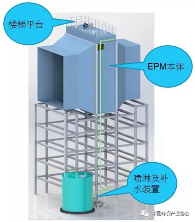 電風(fēng)攔截系統(tǒng)主要由本體、噴淋系統(tǒng)及相應(yīng)的樓梯平臺(tái)等組成,本體包括了氣流分布裝置、預(yù)荷電格柵、陰陽(yáng)極、殼體、高壓電源及控制系統(tǒng)等。具體如下圖所示: