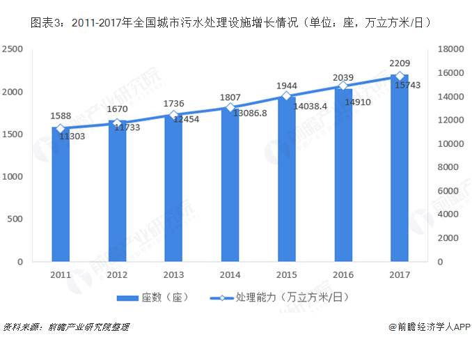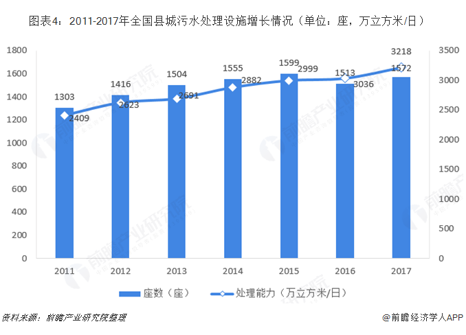 2017年年末,全國縣城共有污水處理廠1572座,比上年增加59座;污水廠日處理能力3218萬立方米,比上年增長5.99%;排水管道長度18.98萬公里,比上年增長10.41%。2017年縣城全年污水處理總量87.77億立方米,污水處理率90.21%,比上年增加2.83個百分點。