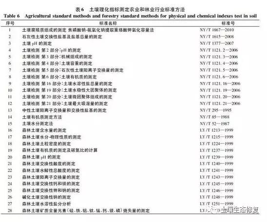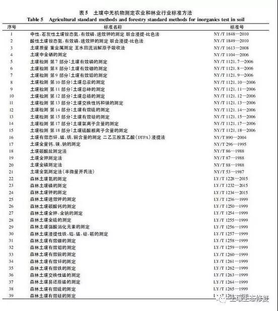8個(gè)理化指標(biāo)等方法中,涉及5個(gè)測(cè)定指標(biāo)(電導(dǎo)率、氧化還原電位、有機(jī)碳、可交換酸度、干物質(zhì)和水分等),以及5種測(cè)定方法(電極法、滴定法、重量法、分光光度法和非分散紅外法等)。另外,農(nóng)業(yè)、林業(yè)也有土壤檢測(cè)標(biāo)準(zhǔn)方法,主要側(cè)重于土壤營(yíng)養(yǎng)元素及其有效態(tài)、理化指標(biāo)的檢測(cè),詳見表5和表6。農(nóng)業(yè)行業(yè)標(biāo)準(zhǔn)方法中,有21個(gè)涉及無機(jī)元素及其有效態(tài)測(cè)定的方法,有15個(gè)涉及土壤理化指標(biāo)的方法;林業(yè)行業(yè)標(biāo)準(zhǔn)方法針對(duì)的是森林土壤,有15個(gè)涉及無機(jī)元素及其有效態(tài)測(cè)定的方法,有13個(gè)涉及土壤理化指標(biāo)的方法。