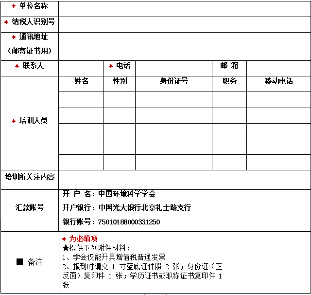 1、培訓(xùn)費(fèi)用:培訓(xùn)班收費(fèi) 3800元/每人,包括培訓(xùn)費(fèi)、資料費(fèi)、證書費(fèi)等。由中國(guó)環(huán)境科學(xué)學(xué)會(huì)收取培訓(xùn)費(fèi)并開具發(fā)票(一律開具增值稅普通發(fā)票),請(qǐng)?jiān)趨R款時(shí)備注“環(huán)境修復(fù)項(xiàng)目經(jīng)理”培訓(xùn)費(fèi)用(參加培訓(xùn)人員姓名),多位人員參加則在括號(hào)內(nèi)逐一填寫參加人員姓名,例:環(huán)境修復(fù)項(xiàng)目經(jīng)理培訓(xùn)費(fèi)(小明/小華/小雷)。住宿可統(tǒng)一安排,費(fèi)用自理。
