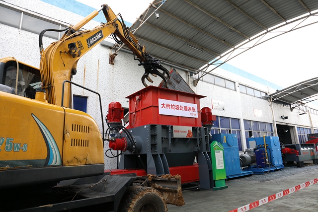 斯瑞德大件生活垃處理設(shè)備“吃進”鋼絲床墊、冰箱、油漆桶、自行車,裝著刀片的滾軸,將這些物料切分、撕碎,直至從出料口出來的是不足20厘米的碎料。