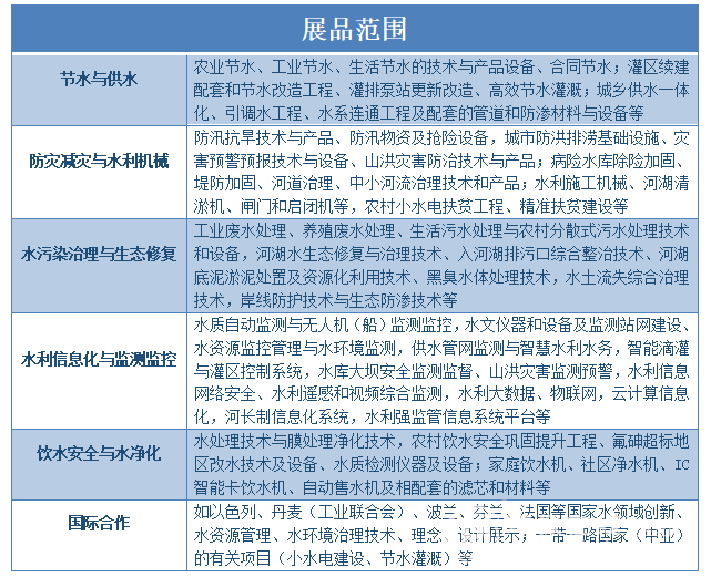 水環(huán)境治理技術的升級,必然帶來涉水行業(yè)服務模式的升級,傳統(tǒng)的商業(yè)模式已不能滿足新命題。在此背景下,水博會作為行業(yè)年度盛會,特別將此次輻射網延伸至節(jié)水與供水、防災減災與水利機械、水污染治理與生態(tài)修復、水利信息化與監(jiān)測監(jiān)控、飲水安全與水凈化、國際合作六大領域。具體如下圖所示: