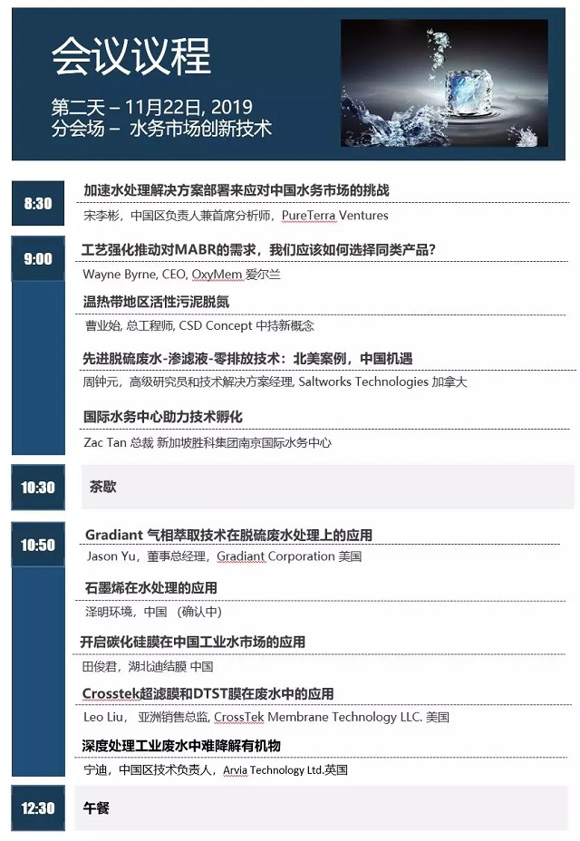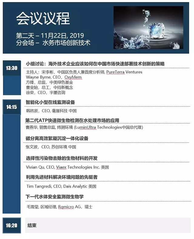 今年的水論壇由來自中國和歐洲的影響力水投資基金PureTerra Ventures將以主旨演講“加速水處理解決方案來應(yīng)對中國水務(wù)市場的挑戰(zhàn)”作為開場。同時水論壇還將以海外技術(shù)企業(yè)在中國市場快速部署技術(shù)創(chuàng)新的策略為主題,進行一場互動式專題討論會。