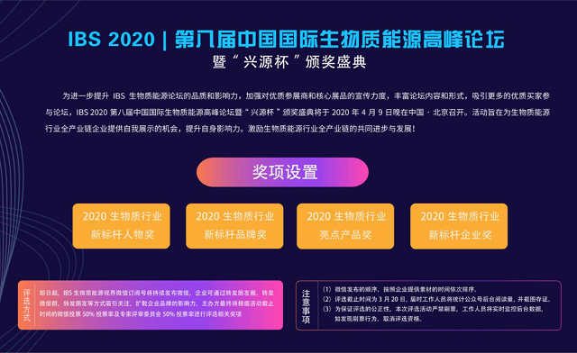 為進(jìn)一步提升IBS生物質(zhì)能源論壇的品質(zhì)和影響力,加強(qiáng)對優(yōu)質(zhì)參展商和核心展品的宣傳力度,豐富論壇內(nèi)容和形式,吸引更多的優(yōu)質(zhì)買家參與論壇,IBS 2020第八屆中國國際生物質(zhì)能源高峰論壇暨“興源杯”頒獎(jiǎng)盛典將于2020年4月9日晚在中國·北京召開。整個(gè)會(huì)議現(xiàn)場將攜手諸多國內(nèi)外知名媒體進(jìn)行全程跟蹤報(bào)道及宣傳,為生物質(zhì)能源行業(yè)全產(chǎn)業(yè)鏈企業(yè)提供自我展示的機(jī)會(huì),更好的樹立公信力和品牌影響力塑造。