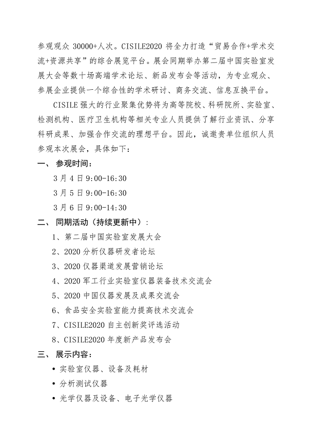 第十八屆中國(guó)國(guó)際科學(xué)儀器及實(shí)驗(yàn)室裝備展覽會(huì)(CISILE2020)將于2020年3月4-6日在北京·國(guó)家會(huì)議中心召開(kāi),預(yù)計(jì)展示面積25000平方米,參展企業(yè)700余家,參觀人次30000人次,同期將舉辦多元化的論壇及互動(dòng)活動(dòng),為廣大科研人員及行業(yè)人士便捷地獲取行業(yè)新資訊、分享前沿技術(shù)和研究成果、交流研討產(chǎn)業(yè)政策搭建交流的平臺(tái)。
