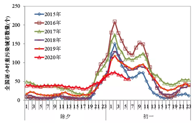圖3 近六年除夕至初一全國(guó)逐小時(shí)重污染城市數(shù)量