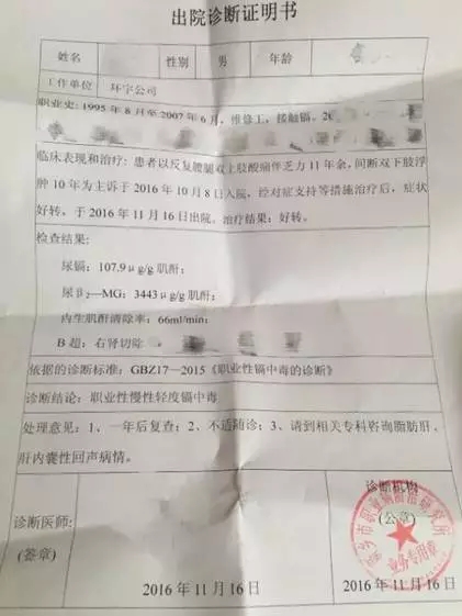 圖為一名環(huán)宇公司工人的出院診斷書,顯示為職業(yè)性慢性輕度鎘中毒