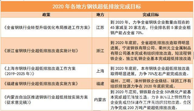 到了2020年,在上述提到的國家目標(biāo)要求下,也是這些地方完成鋼鐵超低排放改造、排放限值執(zhí)行的一個(gè)時(shí)間節(jié)點(diǎn),具體見下表: