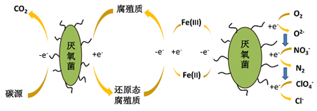 利用醌類物質(zhì)及其聯(lián)合氧化鐵的電子穿梭作用和腐殖質(zhì)中醌類結(jié)構(gòu)大量存在的特點(diǎn),通過在厭氧生物體系中加入腐殖質(zhì)或者同時(shí)加入腐殖質(zhì)和氧化鐵,促進(jìn)體系中的電子傳遞效率,達(dá)到顯著提升高氯酸鹽/硝酸鹽還原效率的效果。