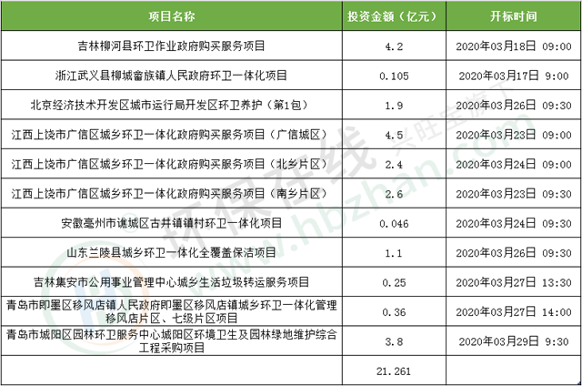 環(huán)保在線關(guān)注環(huán)衛(wèi)市場(chǎng)動(dòng)態(tài)時(shí)發(fā)現(xiàn),短短幾天時(shí)間,招標(biāo)市場(chǎng)就聚集了多個(gè)環(huán)衛(wèi)相關(guān)標(biāo)的,項(xiàng)目總投資額高達(dá)21億元。