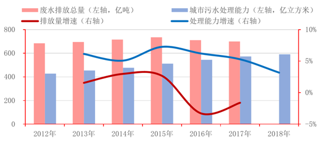 而從治理端來(lái)看,我國(guó)城市污水處理產(chǎn)能常年上漲,至2018年或已達(dá)到16200億立方米/日。將我國(guó)現(xiàn)有的污水處理產(chǎn)單日處理產(chǎn)能代入全年365天滿功率運(yùn)行計(jì)算,2017年僅城市污水處理能力就可以覆蓋同年全國(guó)廢水產(chǎn)生量的82%,這一數(shù)據(jù)較2012年大幅上漲了近20個(gè)百分點(diǎn),足以看出近年來(lái)我國(guó)污水處理行業(yè)的迅猛發(fā)展。