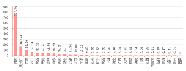 據(jù)各地方部門(mén)統(tǒng)計(jì)上報(bào),治理初期分布在我國(guó)220座城市的2100個(gè)黑臭水體中,廣東省所占數(shù)量最多,有243個(gè),其次為安徽、湖南、山東與江蘇;西藏地區(qū)沒(méi)有黑臭水體問(wèn)題上報(bào)。但如果按水體面積衡量,河南省黑臭水體面積遠(yuǎn)超其他全部省份之和,高達(dá)769.74平方公里,為黑臭水體的“重災(zāi)區(qū)”;相比之下,第二名的黑龍江省僅為168.41平方公里。
