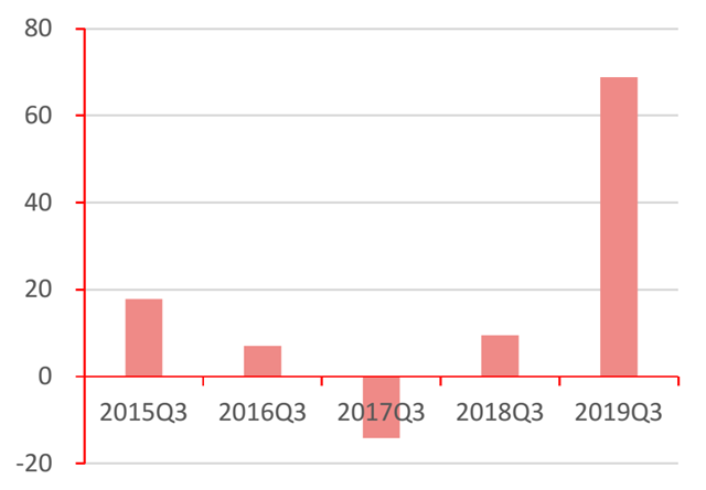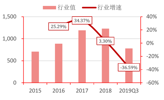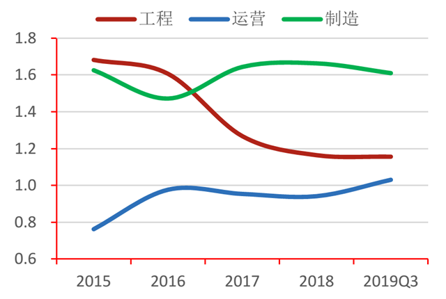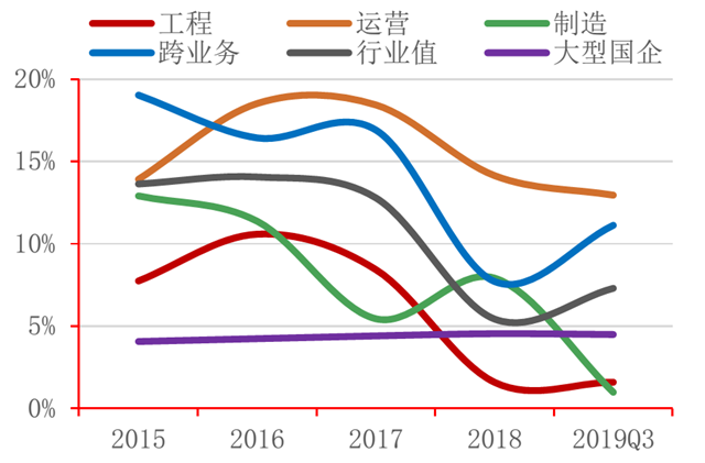 從盈利能力來(lái)看,行業(yè)營(yíng)業(yè)總收入、凈利潤(rùn)增速呈下降趨勢(shì)。其中,營(yíng)業(yè)收入自2015年以來(lái)增速最高達(dá)34.37%,2019年第三季度行業(yè)同比下降9.28%,工程、制造類(lèi)企業(yè)同比下降24.03%、3.75%;凈利潤(rùn)絕對(duì)值在2017年達(dá)到152.17億后, 2018年縮減至66.64億。