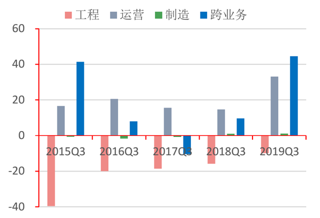 2)流動(dòng)性明顯回暖。其中,運(yùn)營(yíng)、制造與跨業(yè)務(wù)經(jīng)營(yíng)類(lèi)企業(yè)經(jīng)營(yíng)性現(xiàn)金流凈額上升較快,工程類(lèi)企業(yè)三季度凈額負(fù)值收窄。