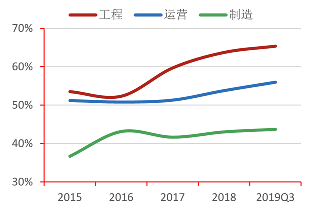 3)杠桿率逐年上升。2016年后行業(yè)杠桿率逐年上升且不斷逼近國(guó)務(wù)院針對(duì)一般工業(yè)企業(yè)杠桿率的指導(dǎo)意見(jiàn)值70%(工程類(lèi)非工業(yè)企業(yè)為75%),其中工程類(lèi)企業(yè)杠桿率明顯高于其他類(lèi)企業(yè),2019年第三季度達(dá)65.40%。