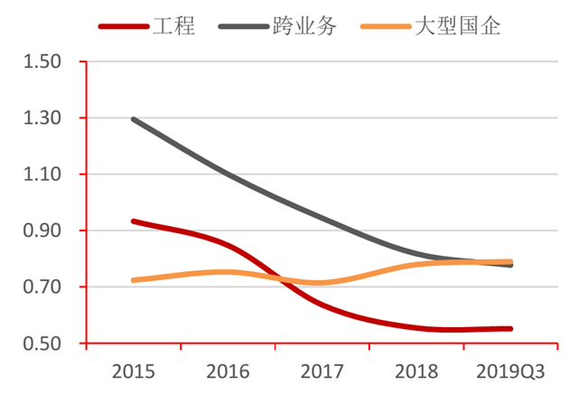 與同樣涉足工程項(xiàng)目的兩類(lèi)企業(yè)相比,大型國(guó)企的流動(dòng)比率和速動(dòng)比率更穩(wěn)定,且呈小幅上升趨勢(shì)。2019年第三季度,大型國(guó)企的流動(dòng)比率為1.14,高于跨業(yè)務(wù)企業(yè);速動(dòng)比率為0.79,高于傳統(tǒng)工程類(lèi)水企。