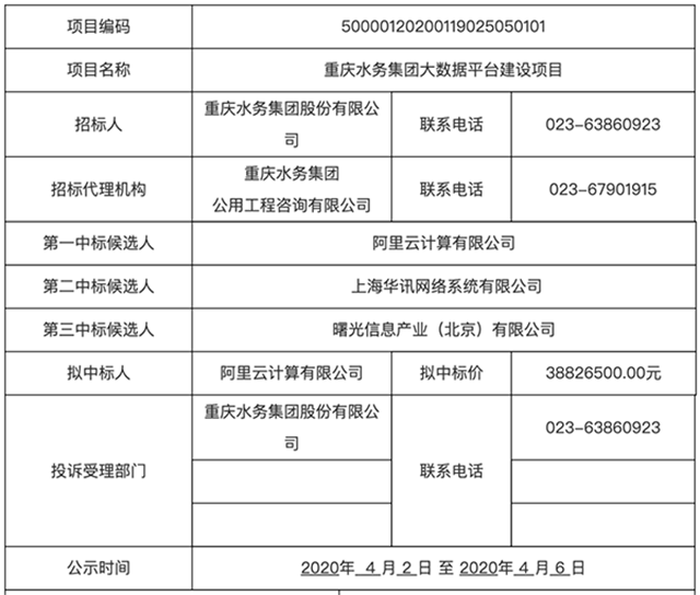 4月2日,重慶水務(wù)集團大數(shù)據(jù)平臺建設(shè)項目發(fā)布中標候選人公示,阿里云計算有限公司