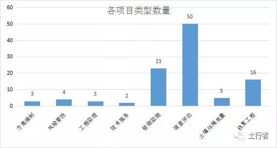 從圖例數(shù)據(jù)分析來看主要項(xiàng)目數(shù)量看以調(diào)查評(píng)估項(xiàng)目為50個(gè),占總項(xiàng)目的48.5%,檢測(cè)監(jiān)測(cè)項(xiàng)目為23個(gè)占總項(xiàng)目的22.3%,修復(fù)工程項(xiàng)目個(gè)數(shù)為15個(gè)占總項(xiàng)目的15.5%。從投資金額上面分析修復(fù)工程項(xiàng)目占總投資額的69%投資金額最多,其次是調(diào)查評(píng)估項(xiàng)目占比20%。