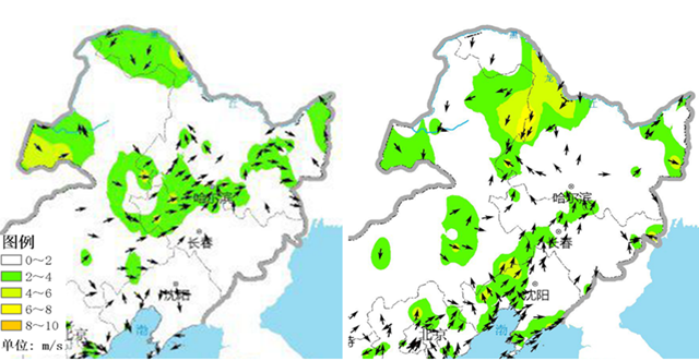 4月13日8時(左)和20時(右)東北地區(qū)風場實況