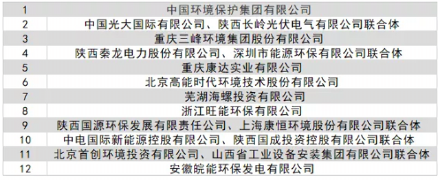 2019年12月27日,該項目發(fā)布資格預審結(jié)果公告,12大垃圾焚燒領(lǐng)域知名企業(yè)入圍,具體名單如下: