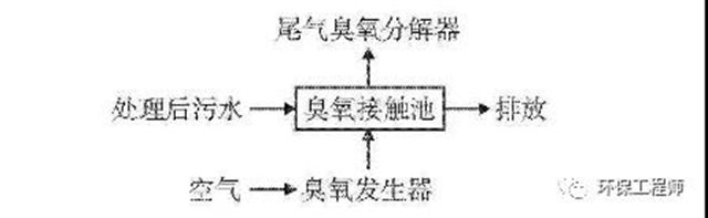 2)污水臭氧處理工藝。臭氧氧化能力強(qiáng),且很不穩(wěn)定,也無(wú)法儲(chǔ)藏,因此應(yīng)根據(jù)需要就地生產(chǎn)。臭氧的制備一般有紫外輻射法、電化學(xué)法和電暈放電法。目前臭氧制備占主導(dǎo)地位的是電暈放電法。由臭氧發(fā)生器制備好的臭氧氣體通過(guò)管道輸送到密閉的臭氧接觸池,與處理后的污水進(jìn)行接觸反應(yīng)。反應(yīng)后的氣體由池頂匯集后,經(jīng)收集器離開(kāi)接觸池,進(jìn)入尾氣臭氧分解器,在此剩余臭氧氣體被分解成氧氣排入大氣中(見(jiàn)圖2)。