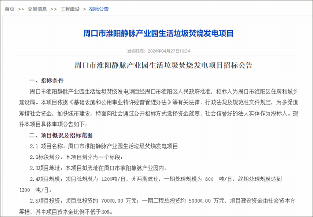 環(huán)保在線從河南省電子招標投標公共服務(wù)平臺獲悉,目前周口市淮陽靜脈產(chǎn)業(yè)園生活垃圾焚燒發(fā)電項目面向社會公開招標,該項目已經(jīng)周口市淮陽區(qū)人民政府批準,招標人為周口市淮陽區(qū)住房和城鄉(xiāng)建設(shè)局。