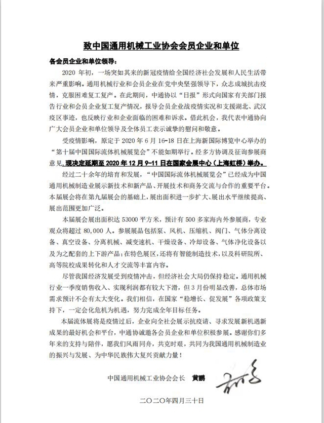 一場(chǎng)突如其來(lái)的疫情打亂了整個(gè)行業(yè)的節(jié)奏,作為年度流體機(jī)械行業(yè)國(guó)際性盛會(huì),為確保海內(nèi)外展商的參展效果,保障廣大展商和觀眾的安全和健康,第十屆中國(guó)(上海)國(guó)際流體機(jī)械展覽會(huì)(IFME)主辦方中國(guó)通用機(jī)械工業(yè)協(xié)會(huì)(以下簡(jiǎn)稱:“中通協(xié)”)決定IFME2020延期舉辦。經(jīng)過(guò)多方積極地協(xié)調(diào)與溝通,中通協(xié)宣布IFME2020遷移至全球一大會(huì)展綜合體——國(guó)家會(huì)展中心(上海), 于12月9-11日舉辦。移師新館的IFME2020戰(zhàn)略布局全面升級(jí),輻射全中國(guó),將再次引領(lǐng)流體機(jī)械行業(yè)轉(zhuǎn)型升級(jí),實(shí)現(xiàn)跨越式發(fā)展。