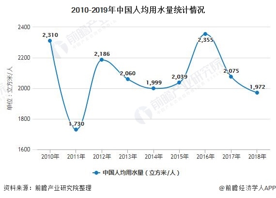 我國水資源長期面臨水資源分布不均、人均占有量少、水資源利用率低的問題。數(shù)據(jù)顯示,2010-2019年,我國用水量大約維持在6000億立方米左右,近兩年的用水總量雖然負(fù)增長,但總量依然較大。同時,2010-2018年,我國人均水資源量呈波動下降趨勢,2018年,中國人均用水量下降至1972立方米/人。