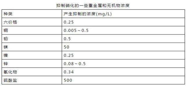 某些重金屬離子、絡(luò)合陰離子、氰化物以及一些有機(jī)物質(zhì)會干擾或破壞硝化細(xì)菌的正常生理活動。當(dāng)這些物質(zhì)在污水中的濃度較高,便會抑制生物硝化的正常運(yùn)行。例如,當(dāng)鉛離子大于0.5mg/L、酚大于5.6mg/L、硫脲大于0.076mg/L時,硝化均會受到抑制。有趣的是,當(dāng)NH3-N濃度大于200mg/L時,也會對硝化過程產(chǎn)生抑制,但城市污水中一般不會有如此高的NH3-N濃度。