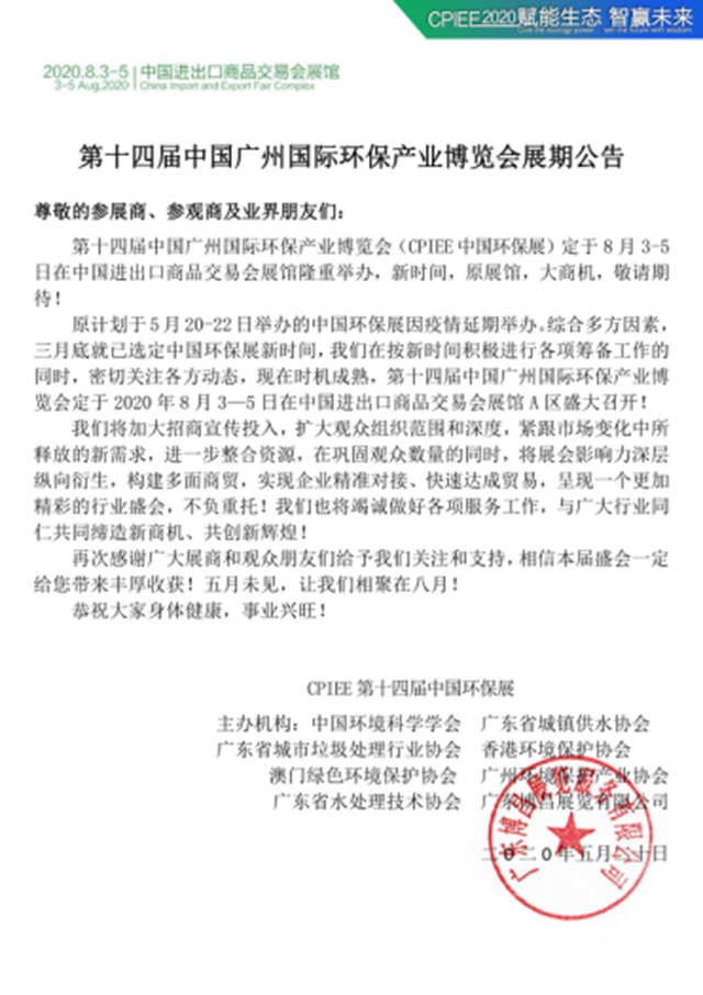 十四年輝煌歷程,CPIEE2020中國環(huán)保展已經(jīng)發(fā)展成為中國乃至亞洲環(huán)境領(lǐng)域較具影響力和號(hào)召力品牌盛會(huì)之一,是環(huán)保全產(chǎn)業(yè)鏈廣泛交流與合作的重要平臺(tái),環(huán)保行業(yè)發(fā)展的重要載體。本屆展會(huì)以“賦能生態(tài),智贏未來”為主題,水、廢氣、固廢、修復(fù)、監(jiān)測(cè)等全環(huán)境產(chǎn)業(yè)鏈集中展示,市政、工業(yè)、農(nóng)村終端環(huán)境治理全覆蓋?;浉郯拇鬄硡^(qū)核心指引,城市群萬億市場(chǎng),未來可期!第十四屆中國環(huán)保展定于2020年8月3日—5日在廣州·中國進(jìn)出口商品交易會(huì)展館盛大開展,將獲得全國生態(tài)環(huán)境市場(chǎng)和行業(yè)人士普遍關(guān)注,聚焦中國環(huán)保展!
