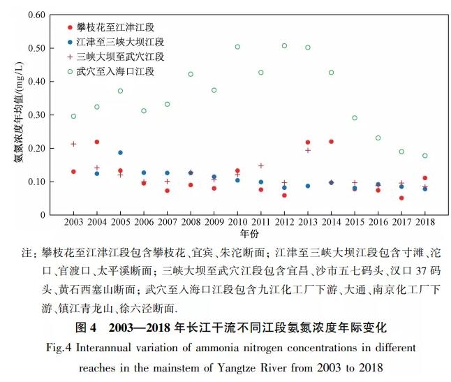 圖 4為2003—2018年長(zhǎng)江干流不同江段氨氮濃度年際變化。由圖 4可見(jiàn):武穴(位于中下游分界點(diǎn)湖口上游約70 km)至入??诮蔚陌钡獫舛茸兎畲螅?003—2012年基本呈上升趨勢(shì),之后至2018年顯著下降,由2012年的0.51 mg/L降至2018年的0.18 mg/L,下降約65%.對(duì)該江段所含各斷面濃度的變化分析表明,九江化工廠下游斷面氨氮降幅最大,由2012年的0.63 mg/L降至2018年的0.13 mg/L,下降約79%;大通、南京化工廠下游和鎮(zhèn)江青龍山斷面在2013—2018年下降分別為53%、78%、77%;徐六涇斷面氨氮濃度從2010年起總體呈下降趨勢(shì),由2010年的0.41 mg/L降至2018年的0.22 mg/L,下降約為46%.上游和下游變幅遠(yuǎn)小于武穴至入海口江段,僅個(gè)別斷面變幅較大,如三峽庫(kù)區(qū)江段的重慶寸灘斷面2010—2018年總體呈下降趨勢(shì),由2010年的0.16 mg/L降至2018年的0.06 mg/L,下降達(dá)63%. 2011年起,中游江段的沙市五七碼頭斷面氨氮濃度呈下降趨勢(shì),由2011年的0.28 mg/L降至2018年的0.10 mg/L,下降約60%.上游攀枝花至江津段氨氮濃度從2013年起也呈明顯下降趨勢(shì)。
