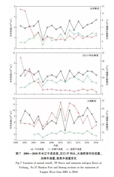 ?、?000年以來(lái),長(zhǎng)江水量未有明顯增大或減小趨勢(shì),但輸沙量大幅下降??偭啄晖颗c年徑流量密切相關(guān),年內(nèi)豐水期總磷通量較高。2001—2006年宜昌斷面、漢口37碼頭斷面氨氮年通量大幅下降;2013—2018年,大通斷面氨氮年通量呈明顯下降趨勢(shì)。