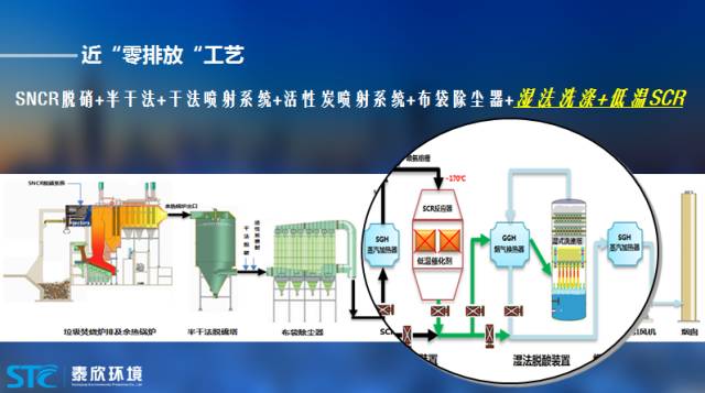 前面一段基本上是標準的半干法工藝,后面添加了一些新的東西。一個是SCR,降低氮氧化物,在SCR的入口有一個SGH蒸汽加熱器,主要是為了達到除塵器的溫度要求,大概能提高30度-50度左右。SCR的出口連接濕法處理設備,進一步脫硫脫塵。