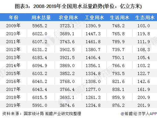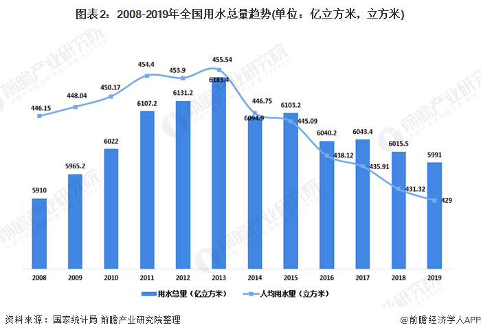 其中,供水處理主要是指供水處理運營企業(yè)從具備取水條件的江河、湖、水庫等自然水區(qū)域進行取水后,對自然水進行過濾、凈化等處理,使自然水達到國家規(guī)定的衛(wèi)生和環(huán)保條件后,通過公共供水管道及其附屬設(shè)施向單位和居民的生活、生產(chǎn)和其他各項建設(shè)提供用水。2019年我國用水總量為5991億立方米,比2018年同比下降0.4%,人均用水量為429立方米。